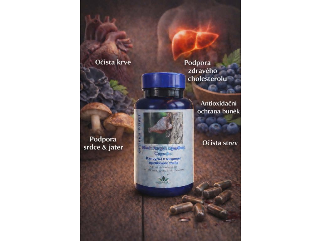 Složení: Myceliem černé stromové houby 180mg, prášek z hub shiitake (houževnatec jedlý - Lentinus Edodes) 160mg, borůvkový extrakt (Vaccinium myrtilus) 60mg, červená kvasnicová rýže, bambusový kafr